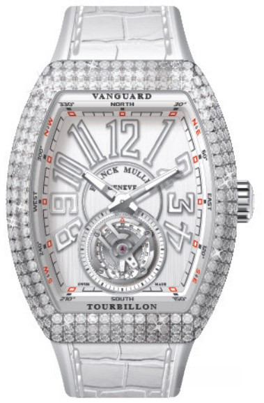 Часы Franck Muller Vanguard V 45 T с турбийоном изготовлены из нержавеющей стали, на ремешке из кожи аллигатора. Бочкообразный корпус имеет размеры 53.7 × 44 х 15.8 мм. Задняя стенка корпуса часов закрытая. Сапфировое стекло с антибликовым покрытием. Циферблат белый. Его окружность украшена крупными арабскими цифрами и двумя стрелками. Каретка парящего турбийона заняла всю нижнюю часть циферблата. Рифленая заводная головка расположена на 3-х часах. Водонепроницаемость составляет 30 метров. Внутри корпуса установлен автоматический механизм с запасом хода 42 часа. Корпус инкрустирован белыми бриллиантами.
