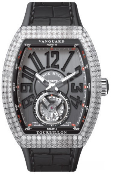 Часы Franck Muller Vanguard V 45 T с турбийоном изготовлены из нержавеющей стали, на ремешке из кожи аллигатора. Бочкообразный корпус имеет размеры 53.7 × 44 х 15.8 мм. Задняя стенка корпуса часов закрытая. Сапфировое стекло с антибликовым покрытием. Циферблат серый. Его окружность украшена крупными арабскими цифрами и двумя стрелками. Каретка парящего турбийона заняла всю нижнюю часть циферблата. Рифленая заводная головка расположена на 3-х часах. Водонепроницаемость составляет 30 метров. Внутри корпуса установлен автоматический механизм с запасом хода 42 часа. Корпус инкрустирован белыми бриллиантами.
