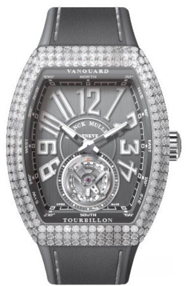 Часы Franck Muller Vanguard V 45 T с турбийоном изготовлены из нержавеющей стали, на ремешке из каучука. Бочкообразный корпус имеет размеры 53.7 × 44 х 15.8 мм. Задняя стенка корпуса часов закрытая. Сапфировое стекло с антибликовым покрытием. Циферблат серый. Его окружность украшена крупными арабскими цифрами и двумя стрелками. Каретка парящего турбийона заняла всю нижнюю часть циферблата. Рифленая заводная головка расположена на 3-х часах. Водонепроницаемость составляет 30 метров. Внутри корпуса установлен автоматический механизм с запасом хода 42 часа. Корпус инкрустирован белыми бриллиантами.