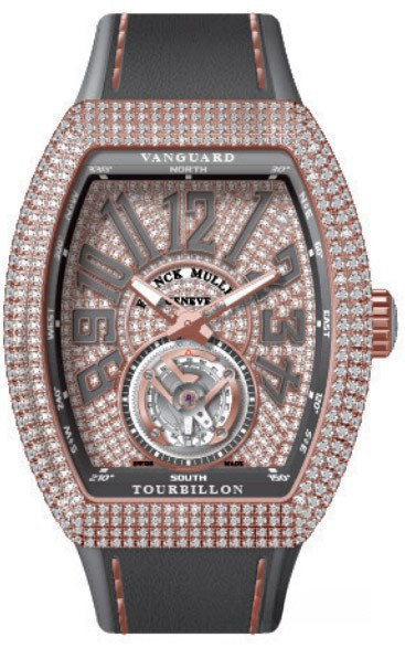 Часы Franck Muller Vanguard V 45 T с турбийоном изготовлены из розового золота 18к, на каучуковом ремешке. Бочкообразный корпус имеет размеры 53.7 × 44 х 15.8 мм. Задняя стенка корпуса часов закрытая. Сапфировое стекло с антибликовым покрытием. Циферблат инкрустирован белыми бриллиантами. Его окружность украшена крупными арабскими цифрами и двумя стрелками. Каретка парящего турбийона заняла всю нижнюю часть циферблата. Рифленая заводная головка расположена на 3-х часах. Водонепроницаемость составляет 30 метров. Внутри корпуса установлен автоматический механизм с запасом хода 42 часа. Корпус инкрустирован белыми бриллиантами.