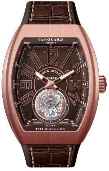 Часы Franck Muller Vanguard V 45 T с турбийоном изготовлены из розового золота 18к, на коричневом ремешке из кожи крокодила. Бочкообразный корпус имеет размеры 53.7 × 44 х 15.8 мм. Задняя стенка корпуса часов закрытая. Сапфировое стекло с антибликовым покрытием. Циферблат коричневого цвета. Его окружность украшена крупными арабскими цифрами и двумя стрелками. Каретка парящего турбийона заняла всю нижнюю часть циферблата. Рифленая заводная головка расположена на 3-х часах. Водонепроницаемость составляет 30 метров. Внутри корпуса установлен автоматический механизм с запасом хода 42 часа.