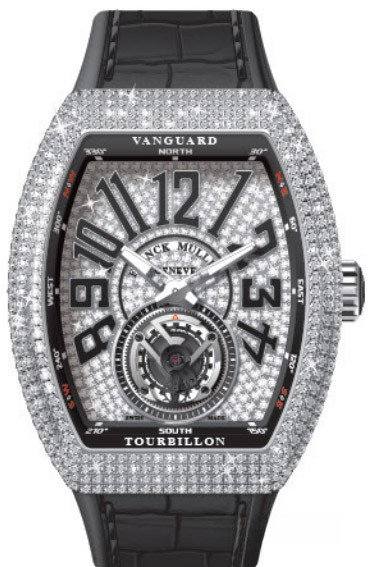 Часы Franck Muller Vanguard V 45 T с турбийоном изготовлены из белого золота 18к, на ремешке из кожи аллигатора. Бочкообразный корпус имеет размеры 53.7 × 44 х 15.8 мм. Задняя стенка корпуса часов закрытая. Сапфировое стекло с антибликовым покрытием. Циферблат инкрустирован белыми бриллиантами. Его окружность украшена крупными арабскими цифрами и двумя стрелками. Каретка парящего турбийона заняла всю нижнюю часть циферблата. Рифленая заводная головка расположена на 3-х часах. Водонепроницаемость составляет 30 метров. Внутри корпуса установлен автоматический механизм с запасом хода 42 часа. Корпус инкрустирован белыми бриллиантами.