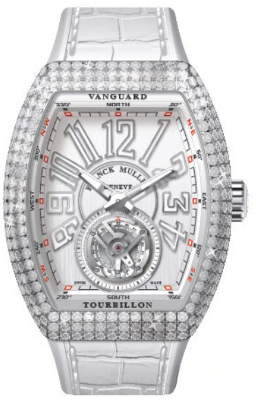Часы Franck Muller Vanguard V 45 T с турбийоном изготовлены из белого золота 18к, на ремешке из кожи аллигатора. Бочкообразный корпус имеет размеры 53.7 × 44 х 15.8 мм. Задняя стенка корпуса часов закрытая. Сапфировое стекло с антибликовым покрытием. Циферблат белый. Его окружность украшена крупными арабскими цифрами и двумя стрелками. Каретка парящего турбийона заняла всю нижнюю часть циферблата. Рифленая заводная головка расположена на 3-х часах. Водонепроницаемость составляет 30 метров. Внутри корпуса установлен автоматический механизм с запасом хода 42 часа. Корпус инкрустирован белыми бриллиантами.