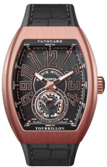 Часы Franck Muller Vanguard V 45 T с турбийоном изготовлены из розового золота 18к, на черном ремешке из кожи крокодила. Бочкообразный корпус имеет размеры 53.7 × 44 х 15.8 мм. Задняя стенка корпуса часов закрытая. Сапфировое стекло с антибликовым покрытием. Циферблат черного цвета. Его окружность украшена крупными арабскими цифрами и двумя стрелками. Каретка парящего турбийона заняла всю нижнюю часть циферблата. Рифленая заводная головка расположена на 3-х часах. Водонепроницаемость составляет 30 метров. Внутри корпуса установлен автоматический механизм с запасом хода 42 часа.