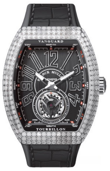 Часы Franck Muller Vanguard V 45 T с турбийоном изготовлены из белого золота 18к, на ремешке из кожи аллигатора. Бочкообразный корпус имеет размеры 53.7 × 44 х 15.8 мм. Задняя стенка корпуса часов закрытая. Сапфировое стекло с антибликовым покрытием. Циферблат черный. Его окружность украшена крупными арабскими цифрами и двумя стрелками. Каретка парящего турбийона заняла всю нижнюю часть циферблата. Рифленая заводная головка расположена на 3-х часах. Водонепроницаемость составляет 30 метров. Внутри корпуса установлен автоматический механизм с запасом хода 42 часа. Корпус инкрустирован белыми бриллиантами.