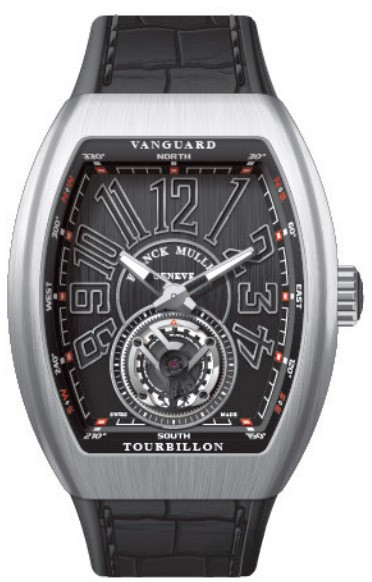 Часы Franck Muller Vanguard V 45 T с турбийоном изготовлены из белого золота 18к, на ремешке из кожа аллигатора. Бочкообразный корпус имеет размеры 53.7 × 44 х 15.8 мм. Задняя стенка корпуса часов закрытая. Сапфировое стекло с антибликовым покрытием. Циферблат черный. Его окружность украшена крупными арабскими цифрами и двумя стрелками. Каретка парящего турбийона заняла всю нижнюю часть циферблата. Рифленая заводная головка расположена на 3-х часах. Водонепроницаемость составляет 30 метров. Внутри корпуса установлен автоматический механизм с запасом хода 42 часа.