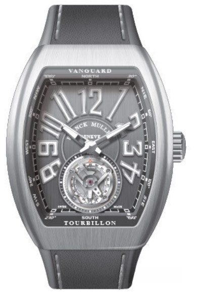 Часы Franck Muller Vanguard V 45 T с турбийоном изготовлены из белого золота 18к, на ремешке из каучука. Бочкообразный корпус имеет размеры 53.7 × 44 х 15.8 мм. Задняя стенка корпуса часов закрытая. Сапфировое стекло с антибликовым покрытием. Циферблат серый. Его окружность украшена крупными арабскими цифрами и двумя стрелками. Каретка парящего турбийона заняла всю нижнюю часть циферблата. Рифленая заводная головка расположена на 3-х часах. Водонепроницаемость составляет 30 метров. Внутри корпуса установлен автоматический механизм с запасом хода 42 часа.