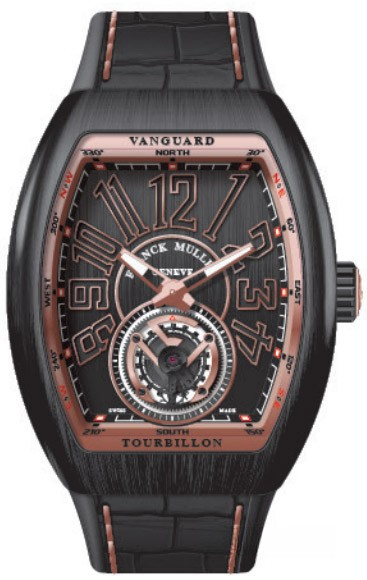 Часы Franck Muller Vanguard V 45 T с турбийоном изготовлены из титана и розового золота 18к, на ремешке из кожи аллигатора. Бочкообразный корпус имеет размеры 53.7 × 44 х 15.8 мм. Задняя стенка корпуса часов закрытая. Сапфировое стекло с антибликовым покрытием. Циферблат черный. Его окружность украшена крупными арабскими цифрами и двумя стрелками. Каретка парящего турбийона заняла всю нижнюю часть циферблата. Рифленая заводная головка расположена на 3-х часах. Водонепроницаемость составляет 30 метров. Внутри корпуса установлен автоматический механизм с запасом хода 42 часа.