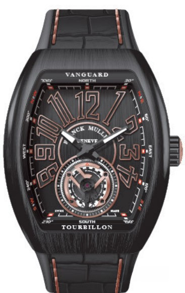 Часы Franck Muller Vanguard V 45 T с турбийоном изготовлены из титана с черным покрытием DLC, на ремешке из кожи аллигатора. Бочкообразный корпус имеет размеры 53.7 × 44 х 15.8 мм. Задняя стенка корпуса часов закрытая. Сапфировое стекло с антибликовым покрытием. Циферблат черный. Его окружность украшена крупными арабскими цифрами и двумя стрелками. Каретка парящего турбийона заняла всю нижнюю часть циферблата. Рифленая заводная головка расположена на 3-х часах. Водонепроницаемость составляет 30 метров. Внутри корпуса установлен автоматический механизм с запасом хода 42 часа.