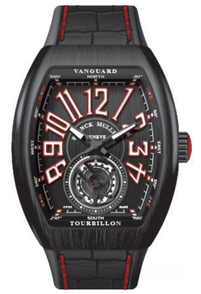 Часы Franck Muller Vanguard V 45 T с турбийоном изготовлены из титана с черным покрытием DLC, на ремешке из кожи аллигатора. Бочкообразный корпус имеет размеры 53.7 × 44 х 15.8 мм. Задняя стенка корпуса часов закрытая. Сапфировое стекло с антибликовым покрытием. Циферблат черный. Его окружность украшена крупными арабскими цифрами и двумя стрелками. Каретка парящего турбийона заняла всю нижнюю часть циферблата. Рифленая заводная головка расположена на 3-х часах. Водонепроницаемость составляет 30 метров. Внутри корпуса установлен автоматический механизм с запасом хода 42 часа.