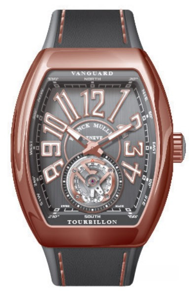 Часы Franck Muller Vanguard V 45 T с турбийоном изготовлены из розового золота 18к, на сером каучуковом ремешке. Бочкообразный корпус имеет размеры 53.7 × 44 х 15.8 мм. Задняя стенка корпуса часов закрытая. Сапфировое стекло с антибликовым покрытием. Циферблат серого цвета. Его окружность украшена крупными арабскими цифрами и двумя стрелками. Каретка парящего турбийона заняла всю нижнюю часть циферблата. Рифленая заводная головка расположена на 3-х часах. Водонепроницаемость составляет 30 метров. Внутри корпуса установлен автоматический механизм с запасом хода 42 часа.