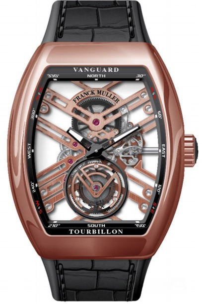 Модель Franck Muller V 45 T SQT представлена в корпусе из розового золота 18к, на ремешке черного цвета из кожи аллигатора. Внутри крупного бочкообразного корпуса размером 44 х 53.7 х 12.8 мм разместился часовой механизм с ручным заводом, Калибр FM 2001, обладающий запасом хода 60 часов. Сквозь скелетированный циферблат отчетливо видны мосты. Сквозь прозрачное сапфировое стекло можна насладится отделкой часового механизма с двух сторон корпуса. Каретка парящего турбийона расположена на 6 часах. Верхний мост украшает гравировка с названием бренда. Две граненные стрелки указывают часы, минуты. Водонепроницаемость корпуса до 30 метров.