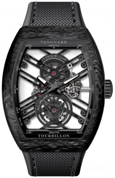 Модель Franck Muller V 45 T SQT представлена в корпусе из карбона, на текстильном ремешке черного цвета. Внутри крупного бочкообразного корпуса размером 44 х 53.7 х 12.8 мм разместился часовой механизм с ручным заводом, Калибр FM 2001, обладающий запасом хода 60 часов. Сквозь скелетированный циферблат отчетливо видны мосты. Сквозь прозрачное сапфировое стекло можна насладится отделкой часового механизма с двух сторон корпуса. Каретка парящего турбийона расположена на 6 часах. Верхний мост украшает гравировка с названием бренда. Две граненные стрелки указывают часы, минуты. Водонепроницаемость корпуса до 30 метров.