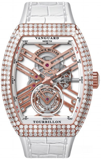 Модель Franck Muller V 45 T SQT представлена в корпусе из розового золота 18к, на ремешке белого цвета из кожи аллигатора. Внутри крупного бочкообразного корпуса размером 44 х 53.7 х 12.8 мм разместился часовой механизм с ручным заводом, Калибр FM 2001, обладающий запасом хода 60 часов. Сквозь скелетированный циферблат отчетливо видны мосты. Сквозь прозрачное сапфировое стекло можна насладится отделкой часового механизма с двух сторон корпуса. Каретка парящего турбийона расположена на 6 часах. Верхний мост украшает гравировка с названием бренда. Две граненные стрелки указывают часы, минуты. Водонепроницаемость корпуса до 30 метров. Корпус инкрустирован белыми бриллиантами.
