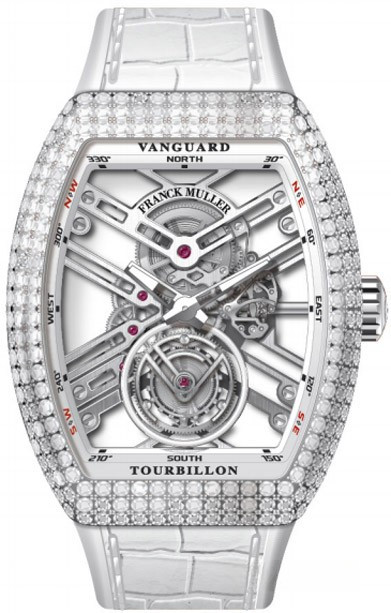 Модель Franck Muller V 45 T SQT представлена в корпусе из нержавеющая сталь, на ремешке белого цвета из кожи аллигатора. Внутри крупного бочкообразного корпуса размером 44 х 53.7 х 12.8 мм разместился часовой механизм с ручным заводом, Калибр FM 2001, обладающий запасом хода 60 часов. Сквозь скелетированный циферблат отчетливо видны мосты. Сквозь прозрачное сапфировое стекло можна насладится отделкой часового механизма с двух сторон корпуса. Каретка парящего турбийона расположена на 6 часах. Верхний мост украшает гравировка с названием бренда. Две граненные стрелки указывают часы, минуты. Водонепроницаемость корпуса до 30 метров. Корпус инкрустирован белыми бриллиантами.