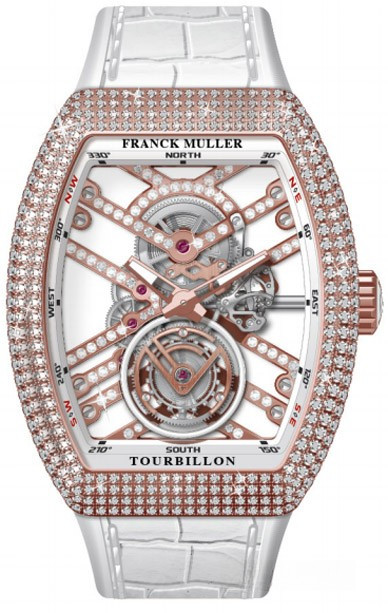 Модель Franck Muller V 45 T SQT представлена в корпусе из розового золота 18к, на ремешке белого цвета из кожи аллигатора. Внутри крупного бочкообразного корпуса размером 44 х 53.7 х 12.8 мм разместился часовой механизм с ручным заводом, Калибр FM 2001, обладающий запасом хода 60 часов. Сквозь скелетированный циферблат с белыми бриллиантами отчетливо видны мосты. Сквозь прозрачное сапфировое стекло можна насладится отделкой часового механизма с двух сторон корпуса. Каретка парящего турбийона расположена на 6 часах. Верхний мост украшает гравировка с названием бренда. Две граненные стрелки указывают часы, минуты. Водонепроницаемость корпуса до 30 метров. Корпус инкрустирован белыми бриллиантами.
