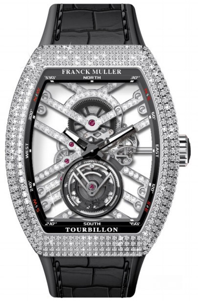 Модель Franck Muller V 45 T SQT представлена в корпусе из нержавеющая сталь, на ремешке черного цвета из кожи аллигатора. Внутри крупного бочкообразного корпуса размером 44 х 53.7 х 12.8 мм разместился часовой механизм с ручным заводом, Калибр FM 2001, обладающий запасом хода 60 часов. Сквозь скелетированный циферблат с белыми бриллиантами отчетливо видны мосты. Сквозь прозрачное сапфировое стекло можна насладится отделкой часового механизма с двух сторон корпуса. Каретка парящего турбийона расположена на 6 часах. Верхний мост украшает гравировка с названием бренда. Две граненные стрелки указывают часы, минуты. Водонепроницаемость корпуса до 30 метров. Корпус инкрустирован белыми бриллиантами.