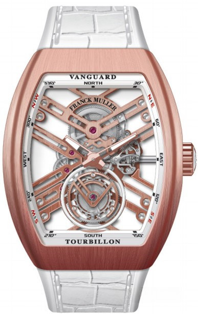 Модель Franck Muller V 45 T SQT представлена в корпусе из розового золота 18к, на ремешке белого цвета из кожи аллигатора. Внутри крупного бочкообразного корпуса размером 44 х 53.7 х 12.8 мм разместился часовой механизм с ручным заводом, Калибр FM 2001, обладающий запасом хода 60 часов. Сквозь скелетированный циферблат отчетливо видны мосты. Сквозь прозрачное сапфировое стекло можна насладится отделкой часового механизма с двух сторон корпуса. Каретка парящего турбийона расположена на 6 часах. Верхний мост украшает гравировка с названием бренда. Две граненные стрелки указывают часы, минуты. Водонепроницаемость корпуса до 30 метров.