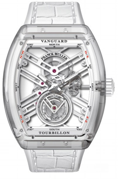 Модель Franck Muller V 45 T SQT представлена в корпусе из сапфира, на ремешке белого цвета из кожи аллигатора. Внутри крупного бочкообразного корпуса размером 44 х 53.7 х 12.8 мм разместился часовой механизм с ручным заводом, Калибр FM 2001, обладающий запасом хода 60 часов. Сквозь скелетированный циферблат отчетливо видны мосты. Сквозь прозрачное сапфировое стекло можна насладится отделкой часового механизма с двух сторон корпуса. Каретка парящего турбийона расположена на 6 часах. Верхний мост украшает гравировка с названием бренда. Две граненные стрелки указывают часы, минуты. Водонепроницаемость корпуса до 30 метров.
