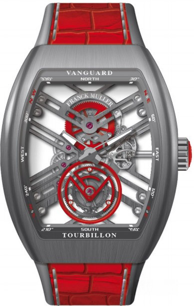 Модель Franck Muller V 45 T SQT представлена в корпусе из титана, на ремешке красного цвета из кожи аллигатора. Внутри крупного бочкообразного корпуса размером 44 х 53.7 х 12.8 мм разместился часовой механизм с ручным заводом, Калибр FM 2001, обладающий запасом хода 60 часов. Сквозь скелетированный циферблат отчетливо видны мосты. Сквозь прозрачное сапфировое стекло можна насладится отделкой часового механизма с двух сторон корпуса. Каретка парящего турбийона расположена на 6 часах. Верхний мост украшает гравировка с названием бренда. Две граненные стрелки указывают часы, минуты. Водонепроницаемость корпуса до 30 метров.