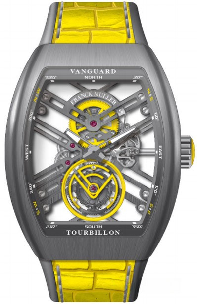Модель Franck Muller V 45 T SQT представлена в корпусе из титана, на ремешке желтого цвета из кожи аллигатора. Внутри крупного бочкообразного корпуса размером 44 х 53.7 х 12.8 мм разместился часовой механизм с ручным заводом, Калибр FM 2001, обладающий запасом хода 60 часов. Сквозь скелетированный циферблат отчетливо видны мосты. Сквозь прозрачное сапфировое стекло можна насладится отделкой часового механизма с двух сторон корпуса. Каретка парящего турбийона расположена на 6 часах. Верхний мост украшает гравировка с названием бренда. Две граненные стрелки указывают часы, минуты. Водонепроницаемость корпуса до 30 метров.