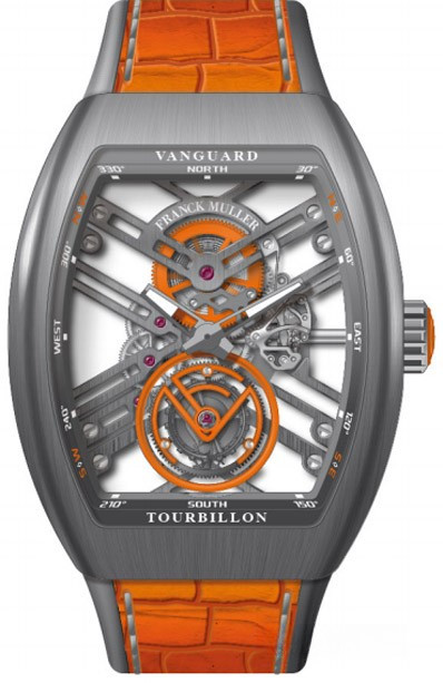 Модель Franck Muller V 45 T SQT представлена в корпусе из титана, на ремешке оранжевого цвета из кожи аллигатора. Внутри крупного бочкообразного корпуса размером 44 х 53.7 х 12.8 мм разместился часовой механизм с ручным заводом, Калибр FM 2001, обладающий запасом хода 60 часов. Сквозь скелетированный циферблат отчетливо видны мосты. Сквозь прозрачное сапфировое стекло можна насладится отделкой часового механизма с двух сторон корпуса. Каретка парящего турбийона расположена на 6 часах. Верхний мост украшает гравировка с названием бренда. Две граненные стрелки указывают часы, минуты. Водонепроницаемость корпуса до 30 метров.