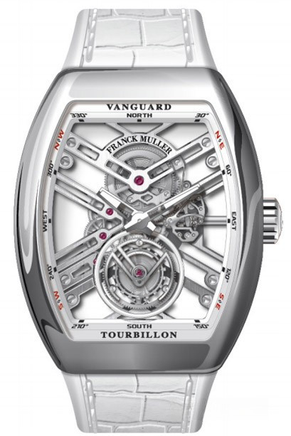 Модель Franck Muller V 45 T SQT представлена в корпусе из нержавеющая сталь, на ремешке белого цвета из кожи аллигатора. Внутри крупного бочкообразного корпуса размером 44 х 53.7 х 12.8 мм разместился часовой механизм с ручным заводом, Калибр FM 2001, обладающий запасом хода 60 часов. Сквозь скелетированный циферблат отчетливо видны мосты. Сквозь прозрачное сапфировое стекло можна насладится отделкой часового механизма с двух сторон корпуса. Каретка парящего турбийона расположена на 6 часах. Верхний мост украшает гравировка с названием бренда. Две граненные стрелки указывают часы, минуты. Водонепроницаемость корпуса до 30 метров.