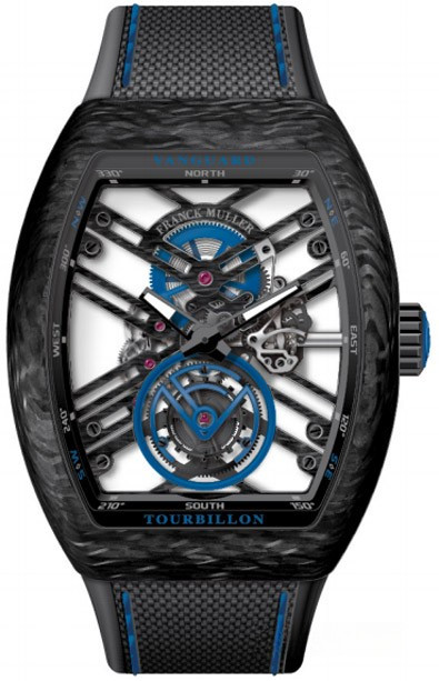 Модель Franck Muller V 45 T SQT представлена в корпусе из карбона, на текстильном ремешке черного цвета. Внутри крупного бочкообразного корпуса размером 44 х 53.7 х 12.8 мм разместился часовой механизм с ручным заводом, Калибр FM 2001, обладающий запасом хода 60 часов. Сквозь скелетированный циферблат отчетливо видны мосты. Сквозь прозрачное сапфировое стекло можна насладится отделкой часового механизма с двух сторон корпуса. Каретка парящего турбийона расположена на 6 часах. Верхний мост украшает гравировка с названием бренда. Две граненные стрелки указывают часы, минуты. Водонепроницаемость корпуса до 30 метров.