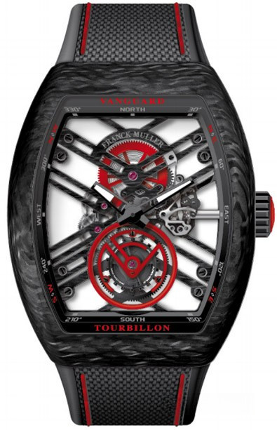 Модель Franck Muller V 45 T SQT представлена в корпусе из карбона, на текстильном ремешке черного цвета. Внутри крупного бочкообразного корпуса размером 44 х 53.7 х 12.8 мм разместился часовой механизм с ручным заводом, Калибр FM 2001, обладающий запасом хода 60 часов. Сквозь скелетированный циферблат отчетливо видны мосты. Сквозь прозрачное сапфировое стекло можна насладится отделкой часового механизма с двух сторон корпуса. Каретка парящего турбийона расположена на 6 часах. Верхний мост украшает гравировка с названием бренда. Две граненные стрелки указывают часы, минуты. Водонепроницаемость корпуса до 30 метров.
