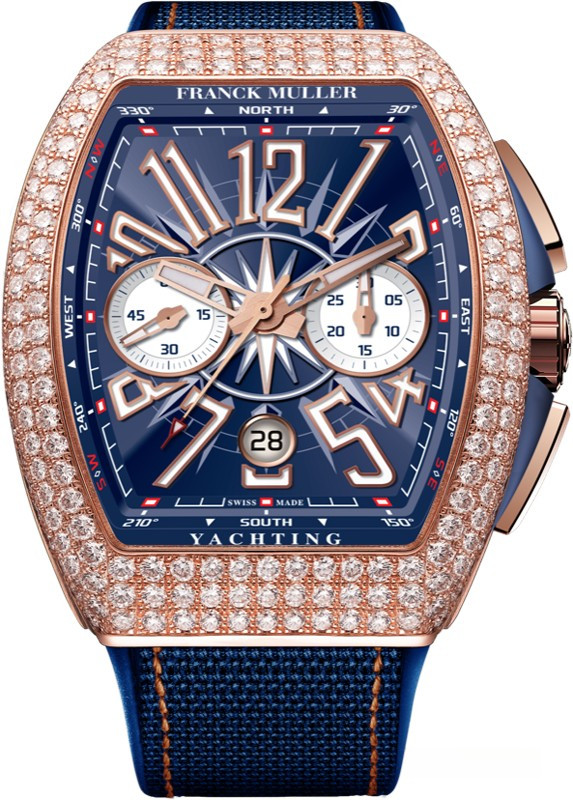 Часы Franck Muller Vanguard V 45 Yachting изготовлены из розового золота 18к, на текстильном ремешке. Бочкообразный корпус имеет размеры 44 x 53.7 x 12.7 мм. Сапфировое стекло с антибликовым покрытием. Циферблат синий. Его окружность украшена крупными арабскими цифрами. На 6-ти часах расположена апертура даты. Рифленая заводная головка расположена на 3-х часах. Водонепроницаемость составляет 30 метров. Внутри корпуса установлен автоматический механизм, Калибр MVT FM 2800-DT с запасом хода 42 часа. Корпус инкрустирован белыми бриллиантами.