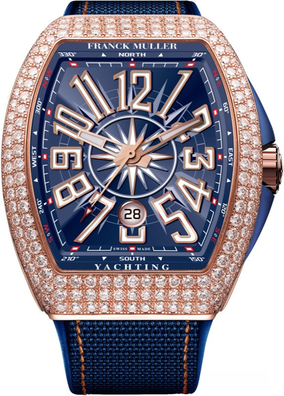 Часы Franck Muller Vanguard V 45 Yachting изготовлены из розового золота 18к, на текстильном ремешке. Бочкообразный корпус имеет размеры 44 x 53.7 x 12.7 мм. Сапфировое стекло с антибликовым покрытием. Циферблат синий. Его окружность украшена крупными арабскими цифрами. На 6-ти часах расположена апертура даты. Рифленая заводная головка расположена на 3-х часах. Водонепроницаемость составляет 30 метров. Внутри корпуса установлен автоматический механизм, Калибр MVT FM 2800-DT с запасом хода 42 часа. Корпус инкрустирован белыми бриллиантами.