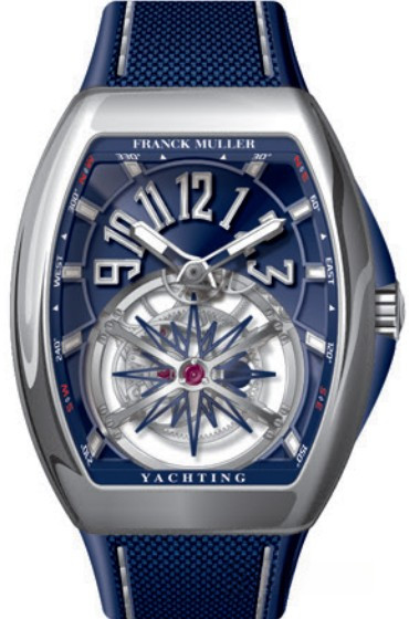 Часы Franck Muller Vanguard V 45 Yachting с турбийоном изготовлены из нержавеющей стали, на текстильном ремешке. Бочкообразный корпус имеет размеры 53.7 × 44 х 15.8 мм. Задняя стенка корпуса часов закрытая. Сапфировое стекло с антибликовым покрытием. Циферблат синий. Его окружность украшена крупными арабскими цифрами и двумя стрелками. Каретка парящего турбийона заняла всю нижнюю часть циферблата. Рифленая заводная головка расположена на 3-х часах. Водонепроницаемость составляет 30 метров. Внутри корпуса установлен автоматический механизм с запасом хода 42 часа.