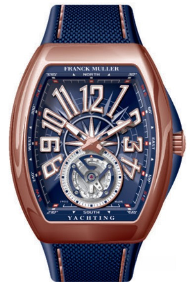 Часы Franck Muller Vanguard V 45 Yachting с турбийоном изготовлены из розового золота 18к, на текстильном ремешке. Бочкообразный корпус имеет размеры 53.7 × 44 х 15.8 мм. Задняя стенка корпуса часов закрытая. Сапфировое стекло с антибликовым покрытием. Циферблат синий. Его окружность украшена крупными арабскими цифрами и двумя стрелками. Каретка парящего турбийона заняла всю нижнюю часть циферблата. Рифленая заводная головка расположена на 3-х часах. Водонепроницаемость составляет 30 метров. Внутри корпуса установлен автоматический механизм с запасом хода 42 часа.