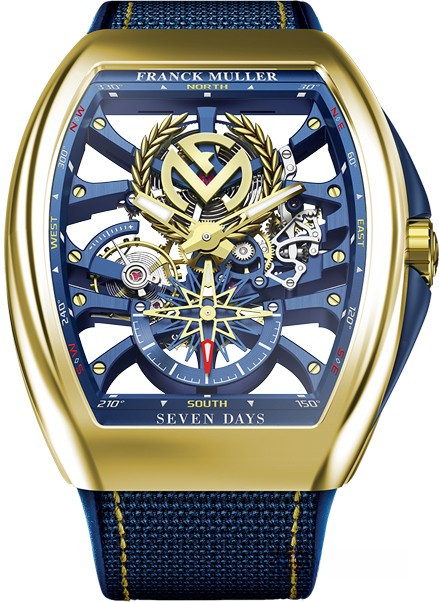 Часы Franck Muller Vanguard Yachting Anchor Skeleton Franck Muller Emblem представлены в корпусе из желтого золота 18к размером 44 х 53.7 х 12.65 мм и водонепроницаемостью 30 метров. Внутри корпуса установлен механизм с ручным заводом, Калибр FM 1740-VS, обладающий запасом хода 168 часов. На синем скелетированным циферблате отображаются часы, минуты, секунды, индикатор натяжения заводной пружины. Модель комплектуется текстильным ремешком с вставкой из желтого золота 18к.