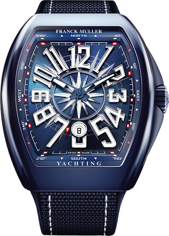 Часы Franck Muller Vanguard Yachting Ceramic изготовлены из керамики, на текстильном ремешке. Бочкообразный корпус имеет размеры 44 x 53.7 x 12.7 мм. Сапфировое стекло с антибликовым покрытием. Циферблат синий. Его окружность украшена крупными арабскими цифрами. На 6-ти часах расположена апертура даты. Рифленая заводная головка расположена на 3-х часах. Водонепроницаемость составляет 30 метров. Внутри корпуса установлен автоматический механизм, Калибр MVT FM 2800-DT с запасом хода 42 часа.