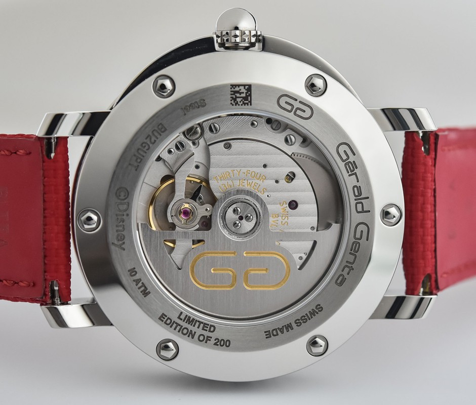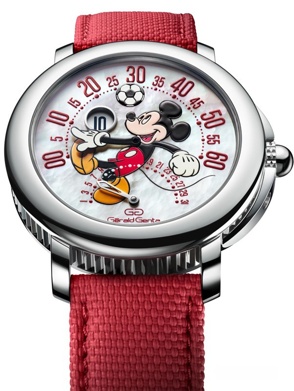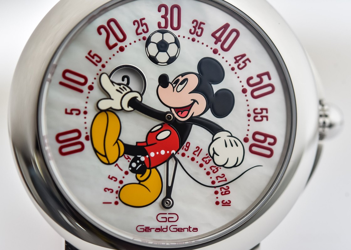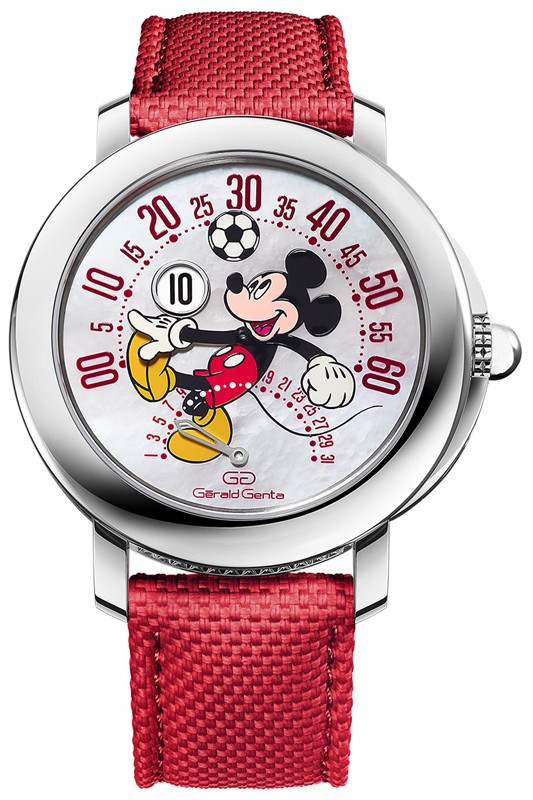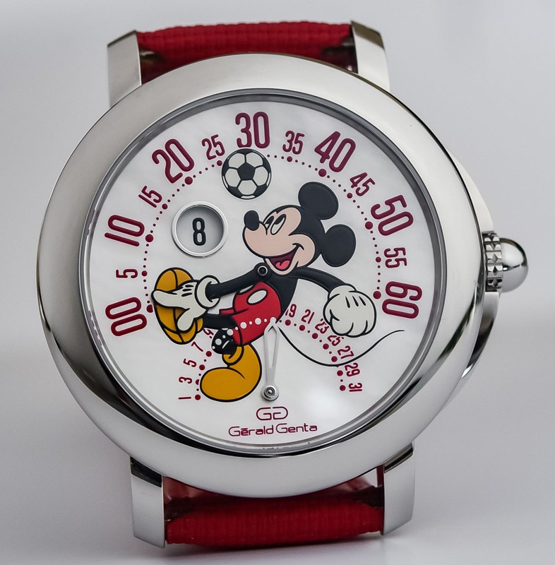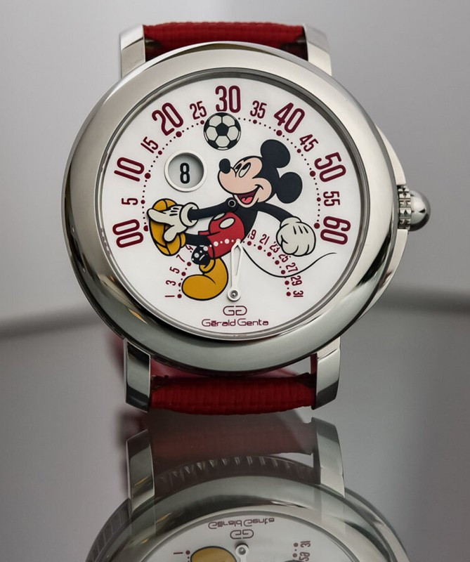 Часы Gerald Genta Mickey Mouse представлены в корпусе размером 41 мм из нержавеющей стали водонепроницаемостью 100 метров. Внутри корпуса установлен автоматический механизм, Калибр BLV300, обладающий запасом хода 42 часа. На белом жемчужном циферблате отображаются часы, минуты, дата.Часы поставляются на кожаном браслете с застежкой из нержавеющей стали. Серия ограничена - 100 шт.