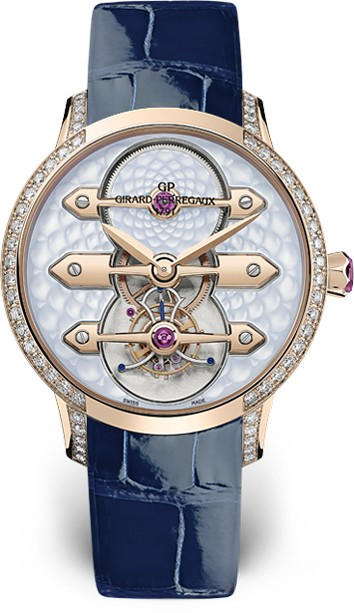 Часы Girard-Perregaux Tourbillon with Three Gold Bridges выпущены в корпусе из розового золота 18к размером 38 х 11.35 мм и водонепроницаемостью 30 м. Внутри корпуса установлен автоматический механизм, Калибр GP09600-0033 с запасом хода 50 часов. На голубом жемчужном циферблате отображаются часы, минуты, секунды. Часы комплектуются ремешком из кожи аллигатора с золотой вставкой. Корпус инкрустирован белыми бриллиантами.