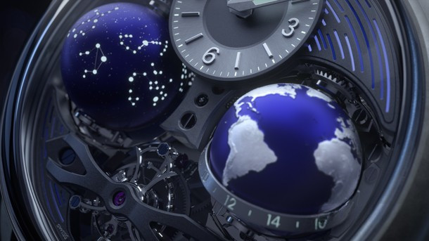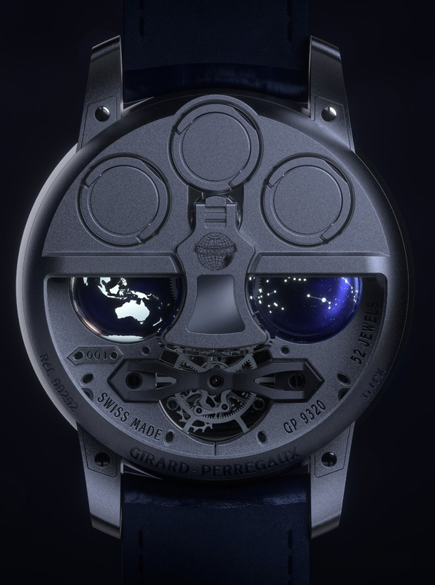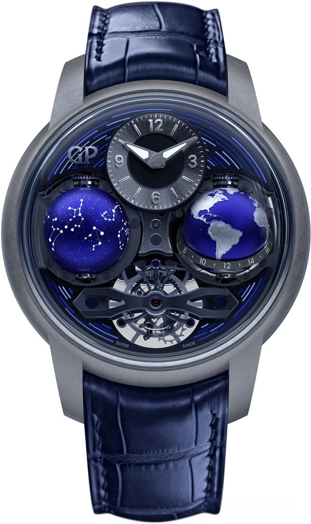 Часы Girard-Perregaux Bridges Cosmos представлены в корпусе из титана размером 48 мм и водонепроницаемостью 30 м. Внутри корпуса установлен механизм с ручным заводом, Калибр GP09320-1098, обладающий запасом хода 60 часов. На синем циферблате отображаются часы, минуты, индикатор день/ночь, указатель зодиакальных созвездий, время второго часового пояса, турбийон. Часы комплектуются ремешком из кожи аллигатора с вставкой из титана.