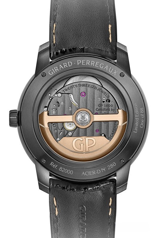 Часы Girard-Perregaux Free Bridge выпущены в корпусе из нержавеющей стали с покрытием DLC. Размер составляет 44 х 12.2 мм, водонепроницаемость 30 м. Внутри корпуса установлен автоматический механизм, Калибр GP01800-1170, обладающий запасом хода 54 часа. На черном циферблате отображаются часы, минуты. Часы комплектуются ремешком из кожи аллигатора с вставкой из нержавеющей стали.