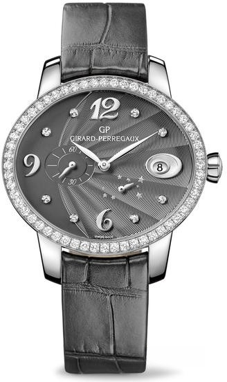 Механические часы с автоподзаводом, обладают запасом хода 46 часов. Калибр GP03300-0070 поддерживает функции часов, минут, секунд, даты и индикатор запаса хода. Часы и минуты отображаются при помощи центральных стрелок, малая секундная стрелка находится на 9-ти часах, апертура даты в районе 3-х часов, индикатор запаса хода - на 4-х. Стальной корпус размером 37.95 х 32.95 мм инкрустирован бриллиантами. Серый циферблат гильоширован и украшен 8-ю белыми бриллиантами. Ремешок из кожи аллигатора с застежкой из нержавеющей стали. Водонепроницаемость корпуса до 30 метров.