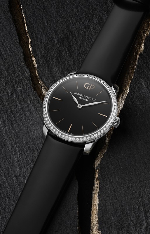 Часы Girard-Perregaux Vintage 1966 Lady Automatic изготовлены из нержавеющей стали. Размер корпуса составляет 30 x 9.15 мм, водонепроницаемость до 30 метров. Внутри корпуса установлен автоматический механизм GP03200-1403 с запасом хода 42 часа. На черном циферблате отображаются часы, минуты. Часы комплектуются ремешком из кожи аллигатора с вставкой из нержавеющей стали. Безель из 60-ти белых бриллиантов. Серия ограничена - 188 шт.