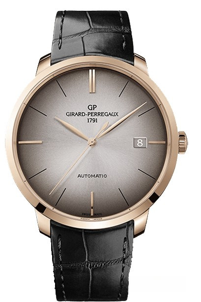 Часы Girard-Perregaux 1966 Automatic 44 mm представлены в корпусе из розового золота 18к размером 44 х 9.82 мм и водонепроницаемостью 30 метров. Внутри корпуса установлен автоматический механизм, Калибр GP01800-0004, обладающий запасом хода 54 часа. На сером гильошированном циферблате отображаются часы, минуты, секунды, дата. Часы поставляются на черном ремешке из кожи аллигатора с вставкой из розового золота 18к.
