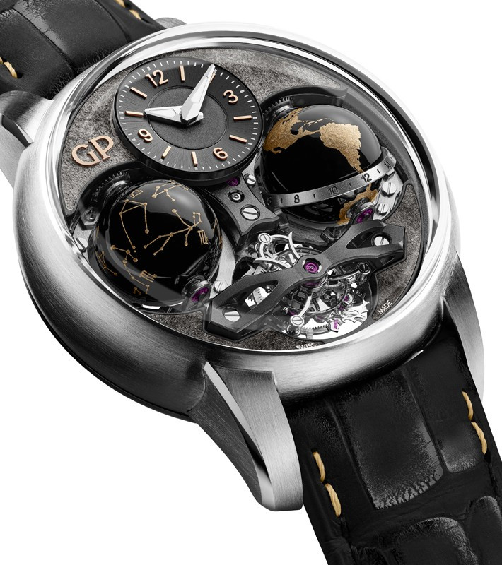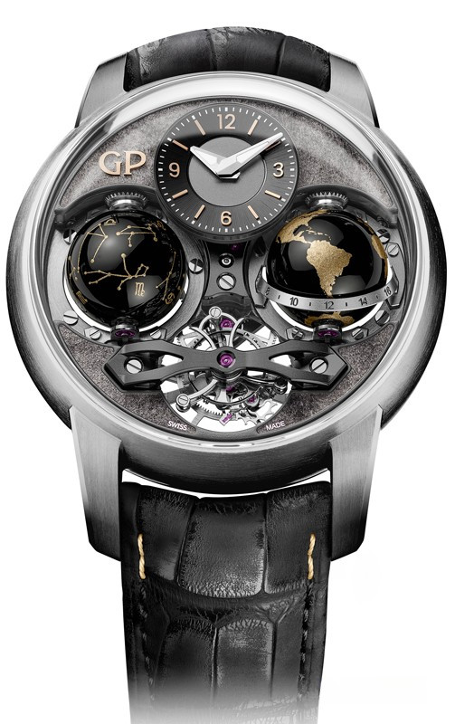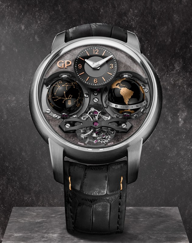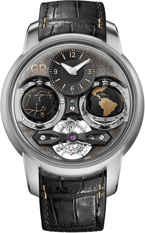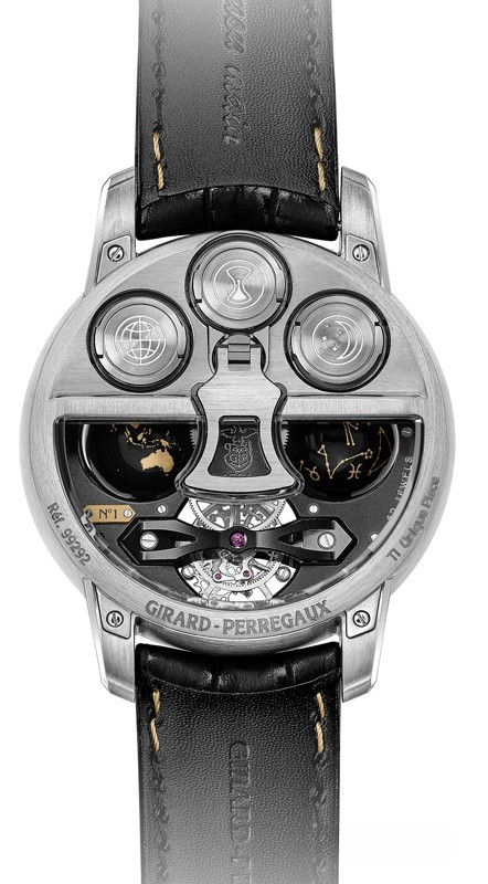 Часы Girard-Perregaux Cosmos представлены в корпусе из титана размером 47 х 22.2 мм водонепроницаемостью 30 метров. Внутри корпуса находится мехнизм с ручным заводом, Калибр GP09320-1902, обладающий запасом хода 57 часов. На сером циферблате отображаются часы, минуты, индикатор день/ночь, индикатор зодиакальных созвездий. Часы поставляются ремешке из кожи аллигатора с титановой застежкой. Серия ограничена - 1 шт.