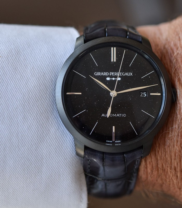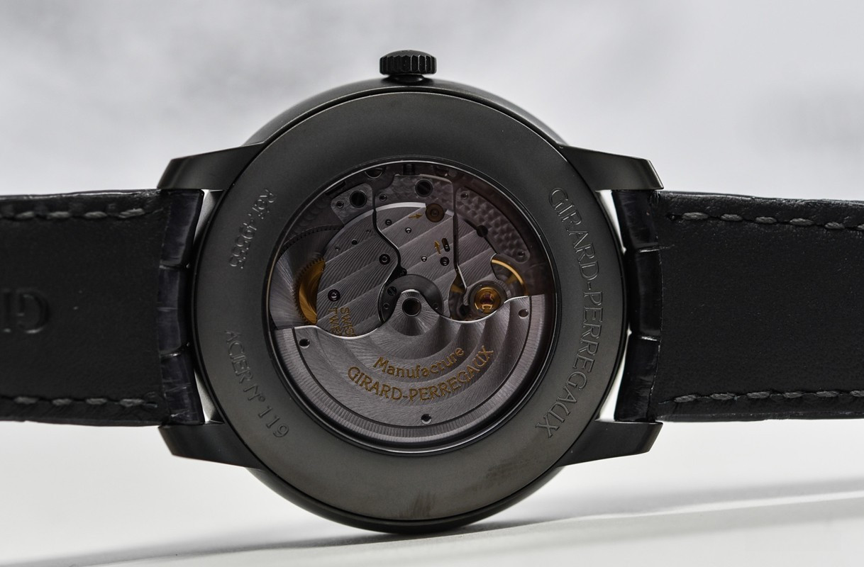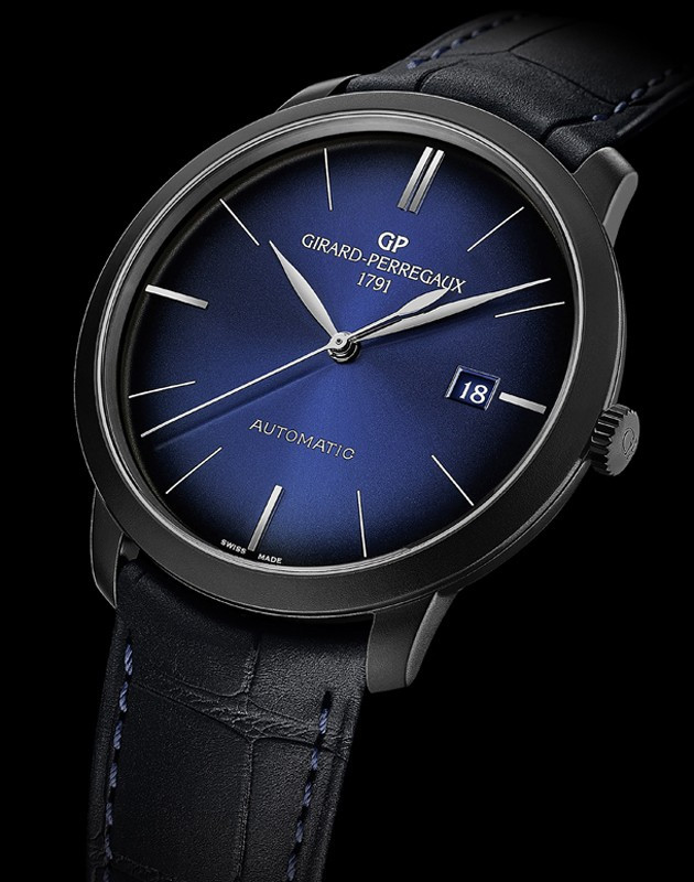 Часы Girard-Perregaux 1966 Orion представлены в корпусе из нержавеющей стали с покрытием DLC размером 40 х 9.4 мм и водонепроницаемостью 30 метров. Внутри корпуса установлен автоматический механизм, Калибр GP03300-0132 с запасом хода 46 часов. На черном авантюриновом циферблате отображаются часы, минтуы, секунды и дата. Часы комплектуются ремешком из кожи аллигатора с вставкой из нержавеющей стали.