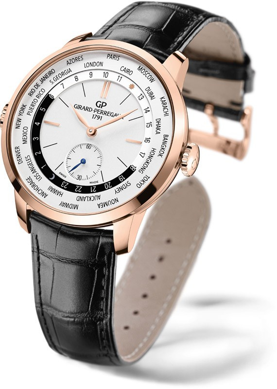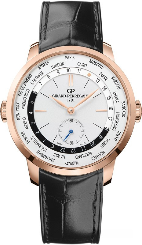 Внутри часов Girard-Perregaux 1966 WW.TC установлен автоматический механизм, Калибр GP03300-0022/0027. На серебристом циферблате отображаются часы, минуты, малая секундная стрелка, иникатор день/ночь, мировое время. Корпус диаметром 40 мм, изготовлен из розового золота 18к. Запас хода составляет 46 часов. Водонепроницаемость до 30 метров. Часы комплектуются ремешком из кожи аллигатора с вставкой из розового золота 18к.