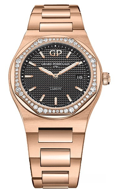 Laureato 34 mm – новая утонченная модель Girard-Perregaux доступна в корпусе из розового золота 18к. Диаметр 34 мм и толщина 7,75 мм придают часам Laureato 34 mm гармоничную легкость пропорций, возможную благодаря плоскому часовому механизму, изготовленному на мануфактуре Girard-Perregaux. Природа этого выбора может показаться неожиданной, но стоит вспомнить, что модель Laureato задумывалась как модель с кварцевым часовым механизмом. И именно Girard-Perregaux стала первым брендом, создавшим кварцевый часовой механизм, предназначенный для женских часов. Безель из белых бриллиантов.
