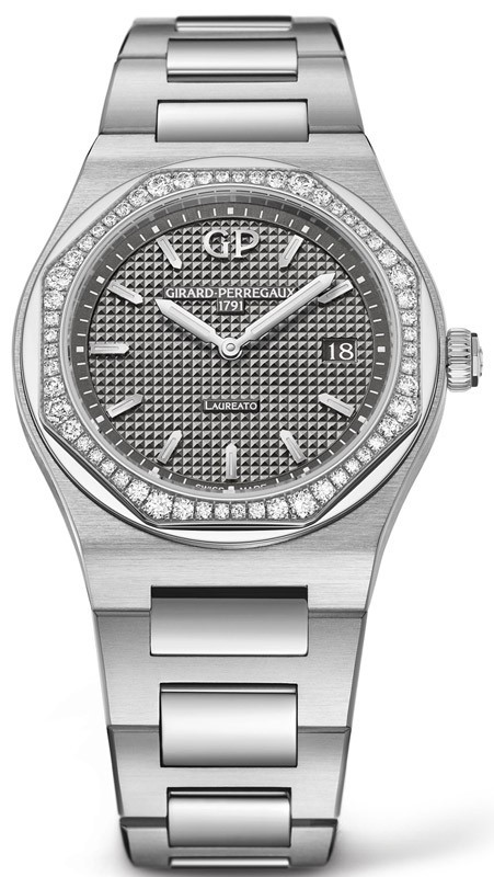 Laureato 34 mm – новая утонченная модель. Сияющая и усыпанная драгоценными камнями. Эта культовая модель Girard-Perregaux доступна в корпусе из стали. Диаметр 34 мм и толщина 7,75 мм придают часам Laureato 34 mm гармоничную легкость пропорций, возможную благодаря плоскому часовому механизму, изготовленному на мануфактуре Girard-Perregaux. Природа этого выбора может показаться неожиданной, но стоит вспомнить, что модель Laureato задумывалась как модель с кварцевым часовым механизмом. И именно Girard-Perregaux стала первым брендом, создавшим кварцевый часовой механизм, предназначенный для женских часов. Безель из белых бриллиантов.