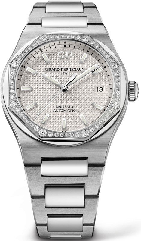Laureato 38 mm – это харизматичная модель, доступная в версиях для мужчин и женщин. Laureato 38 mm представлены в корпусе из нержавеющей стали. Поставляется на браслете из нержавеющей стали. Модель Laureato 38 mm оснащена часовым механизмом GP03300. Этот механический калибр с автоматическим заводом полностью изготовлен специалистами Girard-Perregaux. Точный, надежный Калибр, который приводит в действие часовую, минутную и секундную стрелки, а также указатель даты, делает модель Laureato 38 mm еще более престижной. Безель из белых бриллиантов.