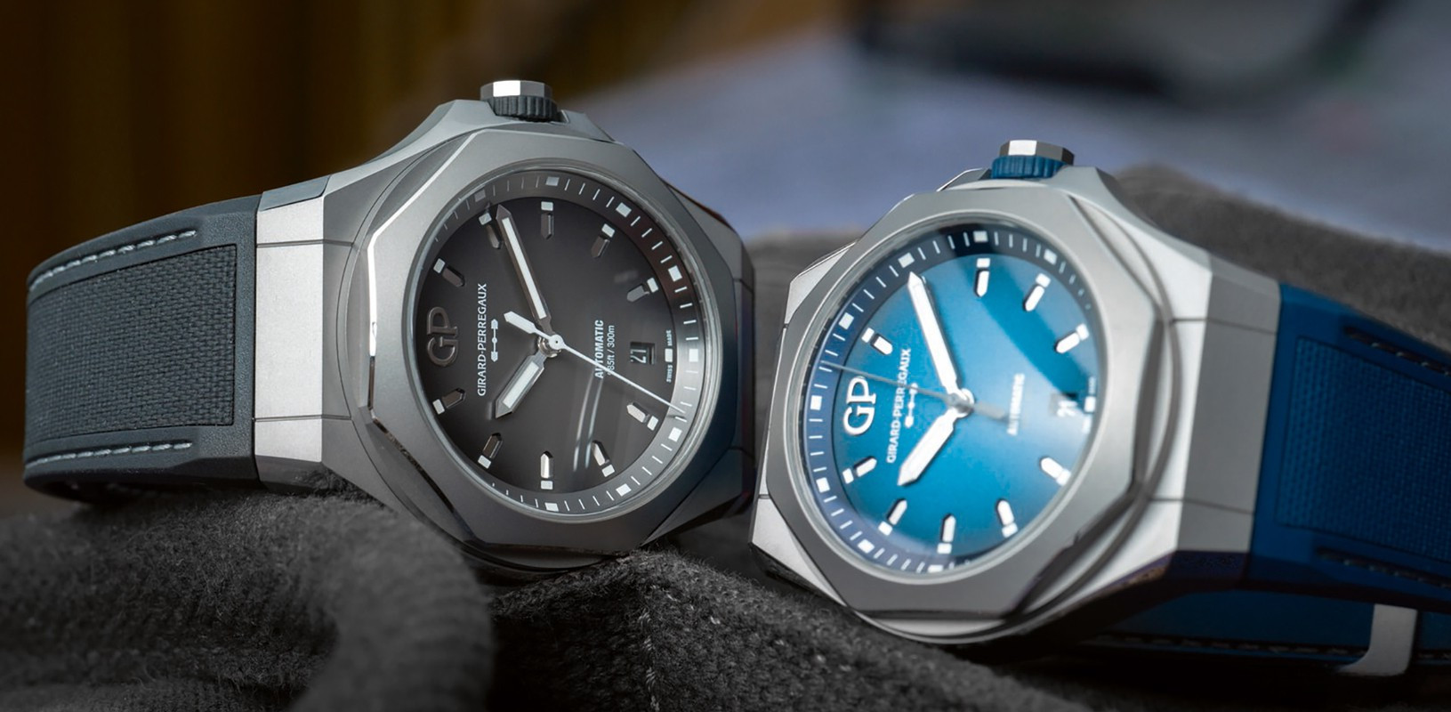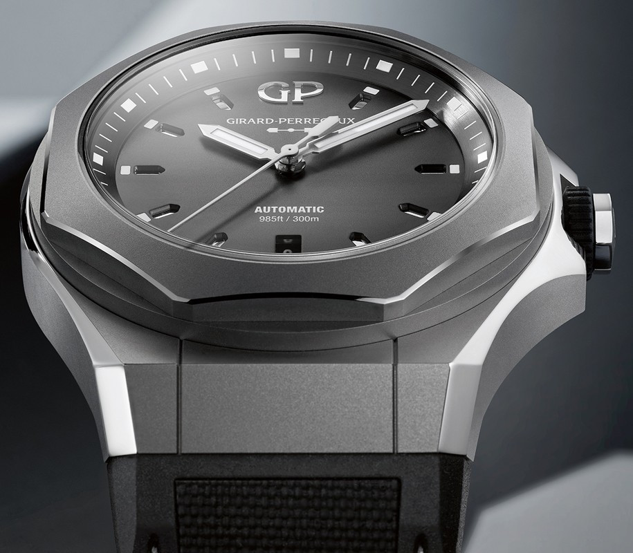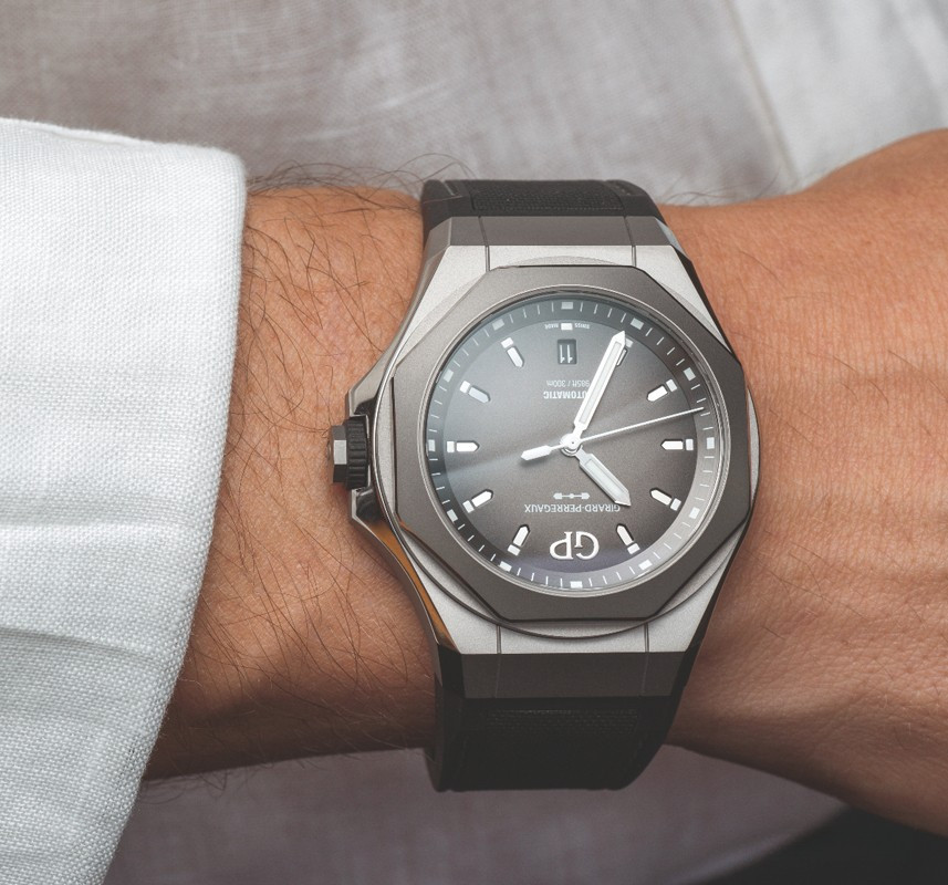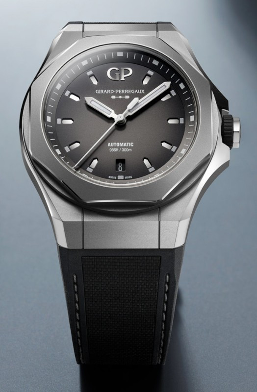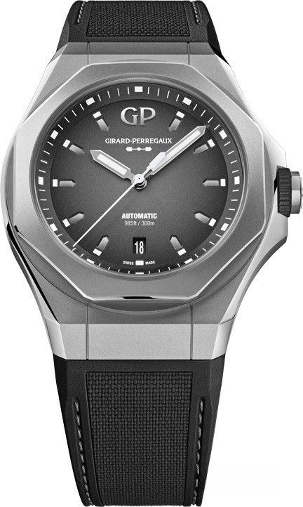 Часы Girard-Perregaux Laureato Absolute представлены в корпусе из титана размером 44 х 14.65 мм и водонепроницаемостью 300 м. Внутри корпуса установлен автоматический механизм, Калибр GP03300-1060, обладающий запасом хода 46 часов. На сером циферблате отображаются часы, минуты, секунды и дата. Часы комплектуются каучуковым ремешком с титановой вставкой. Серия ограничена - 230 шт.