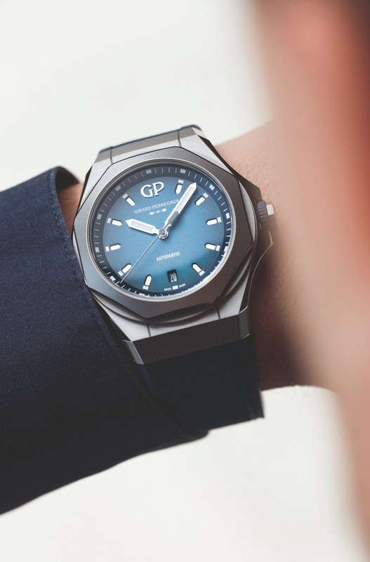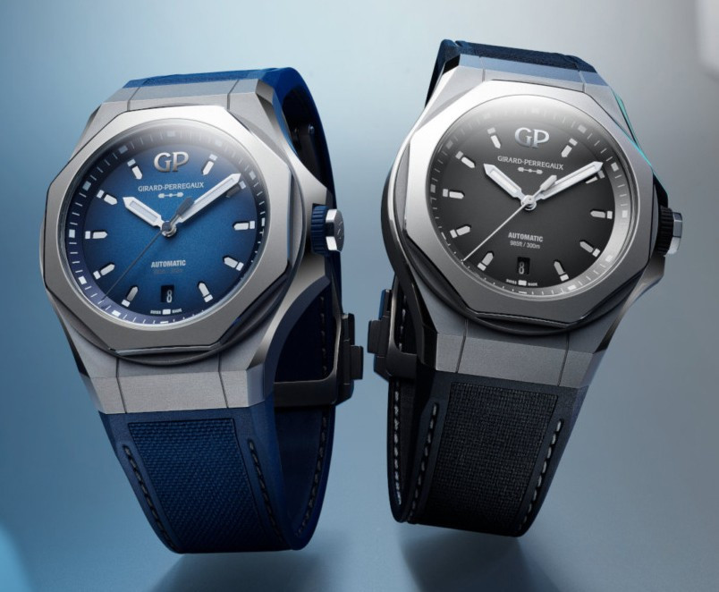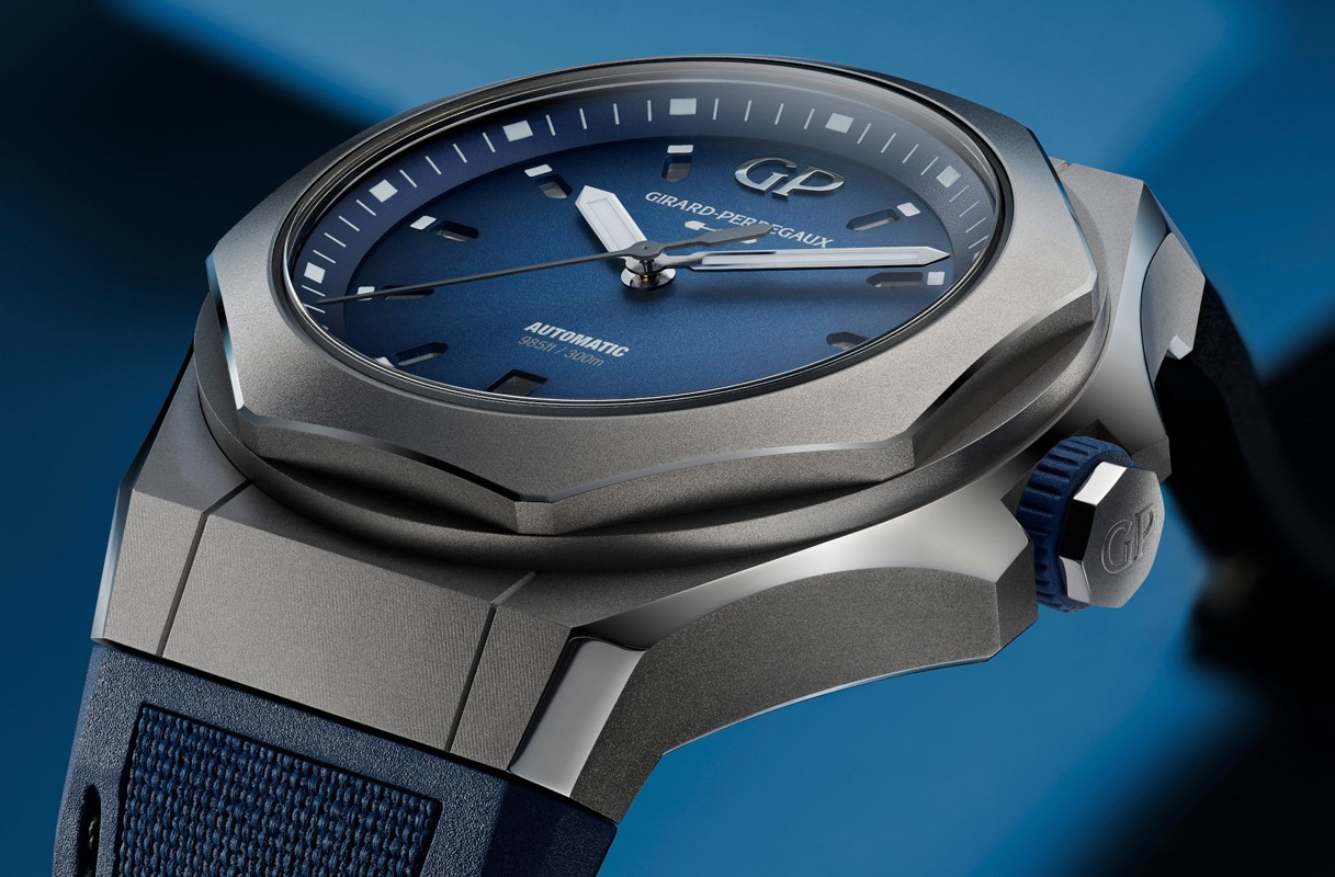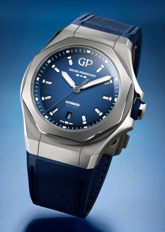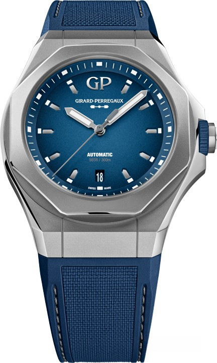 Часы Girard-Perregaux Laureato Absolute представлены в корпусе из титана размером 44 х 14.65 мм и водонепроницаемостью 300 м. Внутри корпуса установлен автоматический механизм, Калибр GP03300-1060, обладающий запасом хода 46 часов. На синем циферблате отображаются часы, минуты, секунды и дата. Часы комплектуются каучуковым ремешком с титановой вставкой. Серия ограничена - 230 шт.